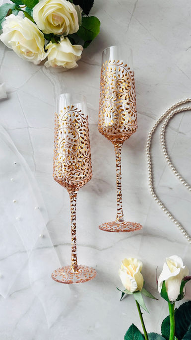 Raise a glass to love. These hand-painted wedding flutes feature intricate designs and thoughtful details, and can be personalized for your special day—perfect for weddings, anniversaries, or keepsakes.